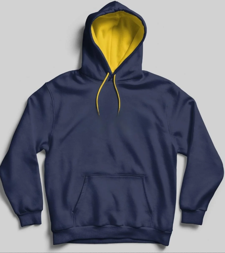 Blusa C/ Capuz em Moletom PA cor Marinho, com forro do Capuz em malha PP cor Amarelo Canário, com cordão cor Canario e ponteira cor Marinho, com bolso tipo Canguru, com estampa frente e costas.